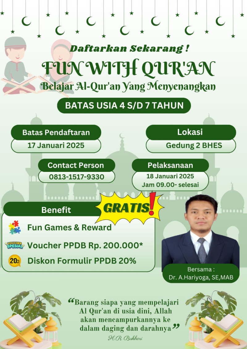 Dengan berbagai kegiatan seru dan interaktif, anak-anak usia 4-7 tahun akan diajak mengenal huruf, kata, hingga makna Al-Quran dengan cara yang menyenangkan. Tidak hanya itu, mereka juga akan belajar nilai-nilai kebaikan dan akhlak mulia yang diajarkan dalam Al-Quran.
